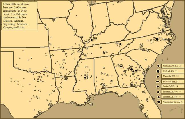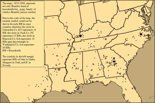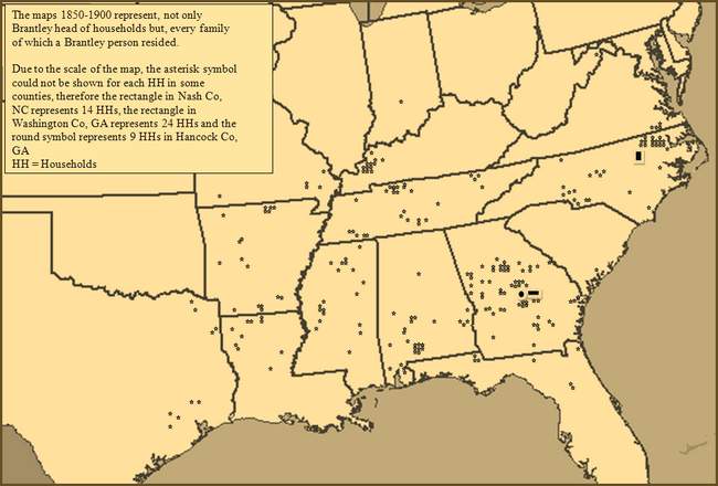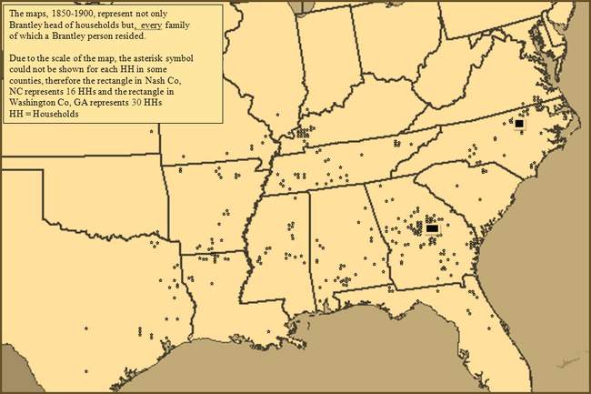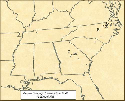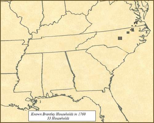 Geographic Movement Brantley Population Expansion 1760-1900 The following maps provide an overall picture of the Brantley population expansion and migrations beginning in 1748. By all evidence, Edward who immigrated to Isle of Wight County in 1638, and his descendants, remained there until that time. We see that year (1748) the grant of land to Lewis Brantley in Edgecombe County (later Granville County), North Carolina. It was soon followed by grants to his brothers, John and Joseph Brantley. These men were all great grandsons of Edward, through son, Phillip, and Phillip's son, Edward (d1736). Another brother, James, had died earlier (1740) in Virginia, yet his sons too, by 1760, were moving into the northeast section of North Carolina. The bulk of the Brantley population today, descend from these sons of Edward Brantley (d1736). The map of 1760 shows the households (HH) of these men and some of their grown descendants who have migrated to North Carolina, as well as the other men of Virginia who descended from Edward's (d 1736), siblings and uncles. It has been a remarkable observation to see that, while many descendants may exist, comparatively, very few of these who remained in Virginia have descendants, surnamed Brantley or Brantly, living among us today. While those of Edward (d1736) who migrated south, have multitudes, they have very few. From what we can see, less than 8% of the Brantley households in 1900 are descendants of these other men of Virginia. The following analysis and maps depicts the movement of the Brantley population, generally south and westward, through 1900. Except for the North Carolina census data which survived the Capital fire of the War of 1812, the data presented in years preceding 1820, are based on our vast collection of tax and deed records found throughout the south during the respective census years. The data in 1820 and afterwards is based almost exclusively by reference to census data. The following population 1740 - 1810 is based on a limited census collection and a life time of study of the Brantley family in America. It cannot however be considered conclusive. Many lived and died who never appeared in a record that has survived to our day. This is only a thumbnail sketch. For more detailed census information by state and downloadable maps please click here.